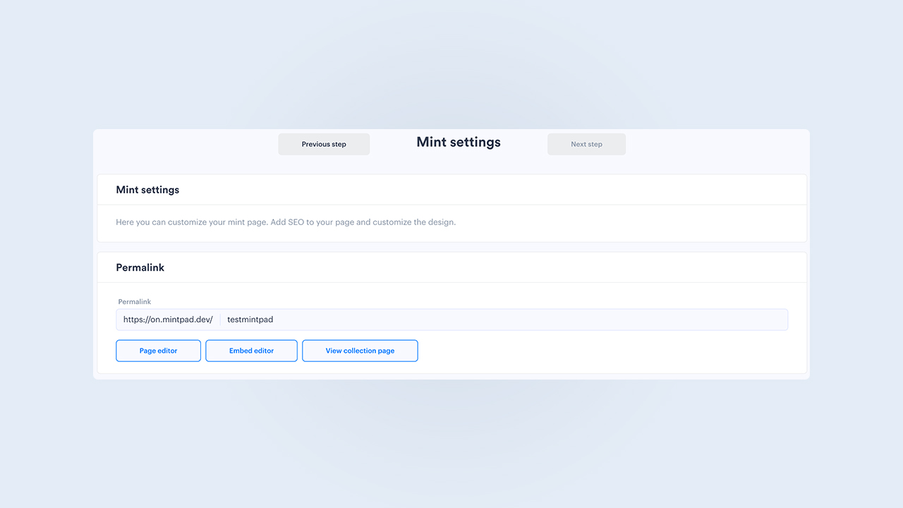 If you go to the previous tab (where you can find the mint settings), you can check out your final collection page by clicking on the 'View collection page' button. This is the page that collectors will see when they are ready to mint your NFTs.